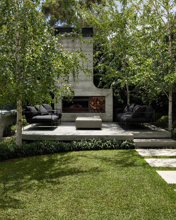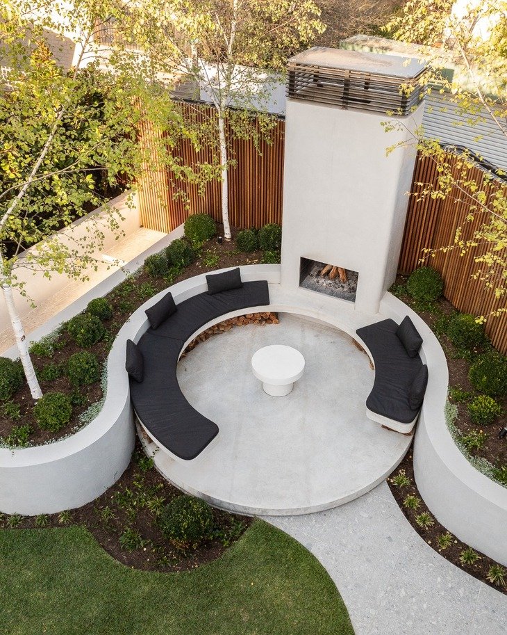 The last idea feels like a backyard hideaway. A raised concrete platform sits slightly above the lawn, with a tall concrete fireplace centered between two deep cushioned lounge sofas. The whole area is surrounded by trees, making it feel private and serene, like a little woodland lounge tucked away from the rest of the yard. It’s simple, but the atmosphere is strong.