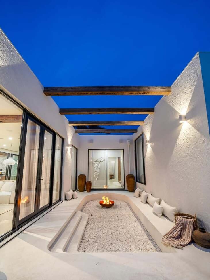 This second patio is a long, narrow courtyard with a sunken fire pit right in the center, surrounded by low white concrete benches. There’s gravel at the bottom, soft pillows along the back, and wood beams above that frame the sky. It feels like a little secret lounge hidden between the house walls.