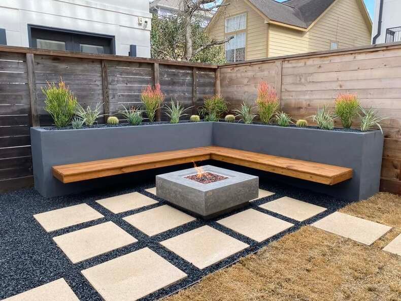 Idea three is all about smart corners. There’s a gray concrete L-shaped planter wall that doubles as the back of a long wooden bench. In front sits a chunky square concrete fire pit. The floor is a grid of big square pavers with dark gravel in between, which makes everything feel clean and kind of graphic.