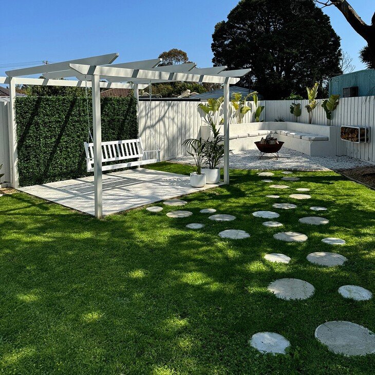The fifth idea feels more relaxed and kind of cottage-meets-modern. There’s a small pergola with a white swing, a lush lawn, and a path of round concrete stepping stones that leads to a corner seating area. The corner has a floating white concrete bench wrapped around white gravel, with a simple metal fire bowl in the center.