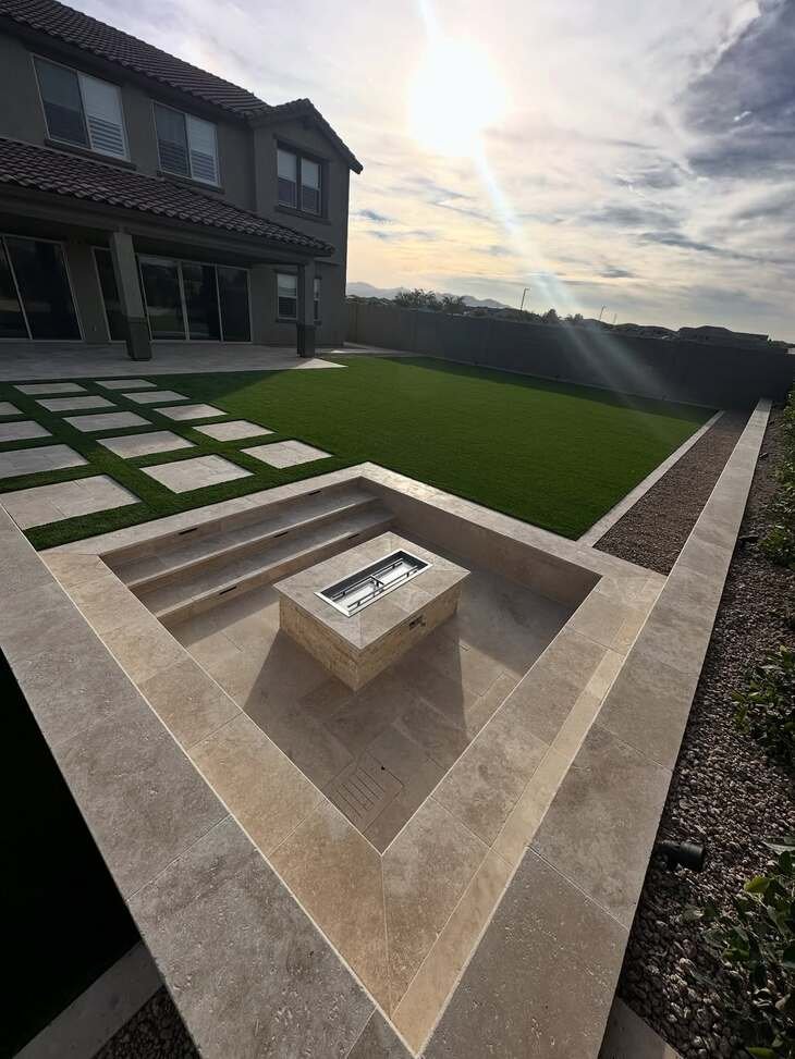 This next space is a minimalist dream. You’ve got a big open lawn, and right in the middle of the patio there’s a sunken square fire pit with matching concrete steps on two sides. The surfaces are a warm beige stone instead of gray, which makes the whole yard feel warmer and a bit more Mediterranean.