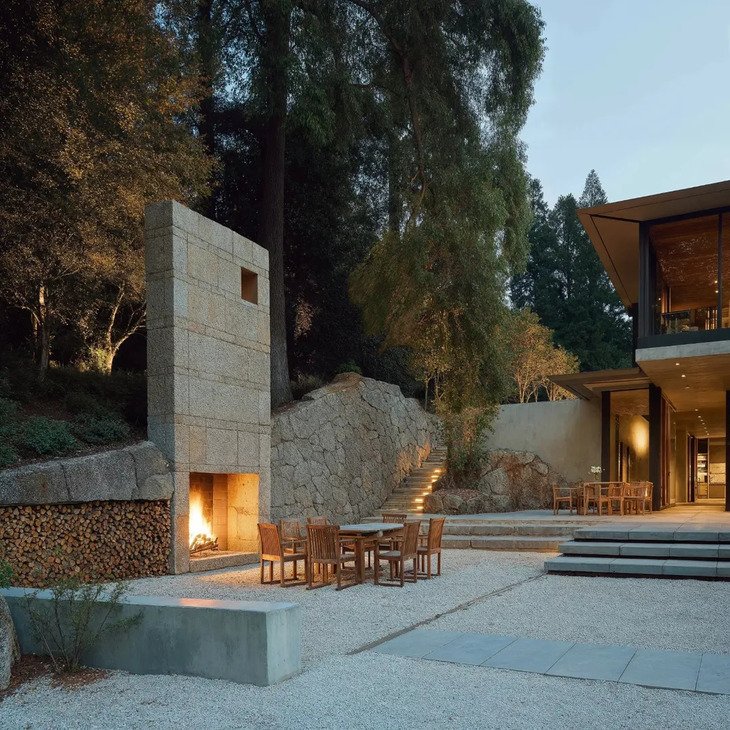 This design immediately pulls your eyes to the perfect round shape of the patio. It’s sunken just a little, with curved white concrete benches wrapping around the space like a hug. A tall concrete fireplace anchors the backdrop, and the area has been landscaped with soft green shrubs and slender trees that make the whole place feel sculptural and peaceful.