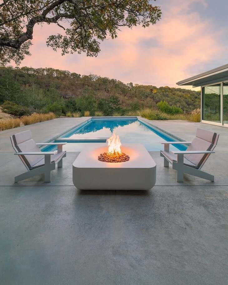 This idea keeps things really sleek: a smooth concrete slab patio around a long pool, with one simple white fire table and two low chairs facing the water. That’s literally it. No clutter, no huge furniture set, just a clean line of fire mirroring the line of the pool.