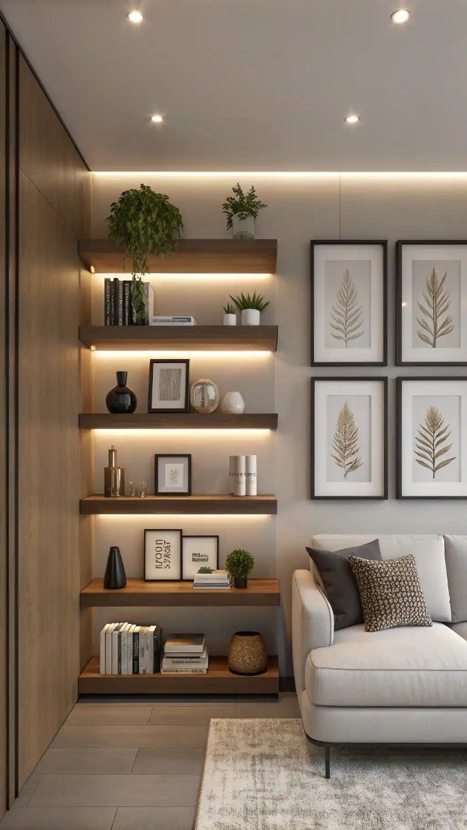My approach to corner living room decorating ideas centers on creating visual interest through layered elements. The staggered floating shelves provide ample space for displaying decorative objects, books, and greenery, while the warm LED strip lighting enhances the ambiance and highlights the displayed items.