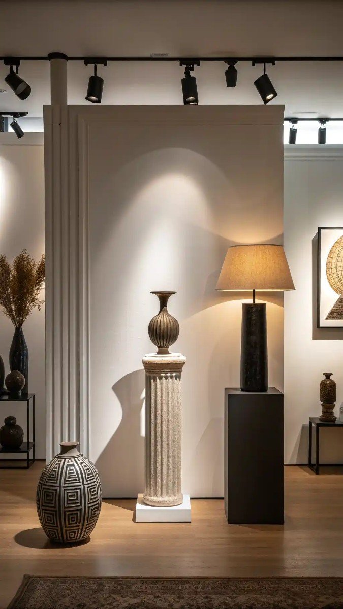 I’ve opted for a blend of textures and heights. The tall, ornate pillar paired with the sleek, dark lamp creates visual interest. Using varying heights – from the floor vase to the lamp – is crucial for dynamic composition. This approach prevents the corner from feeling flat and uninspired.