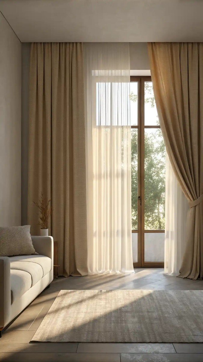 I believe that effectively utilizing natural light is paramount in interior design. Here, the sheer curtains diffuse the sunlight, creating a soft, gentle glow that enhances the overall ambiance. The neutral color palette, dominated by warm beige tones in the curtains and rug, further amplifies this effect. This creates a calming atmosphere perfect for relaxation.