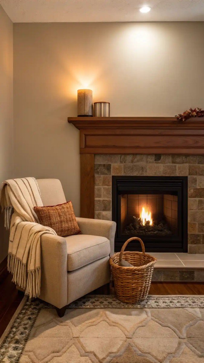 The placement of the armchair angled towards the fireplace immediately draws the eye and creates a natural focal point. The addition of a soft throw and decorative pillow enhances the cozy atmosphere, making it an ideal spot for reading or unwinding.