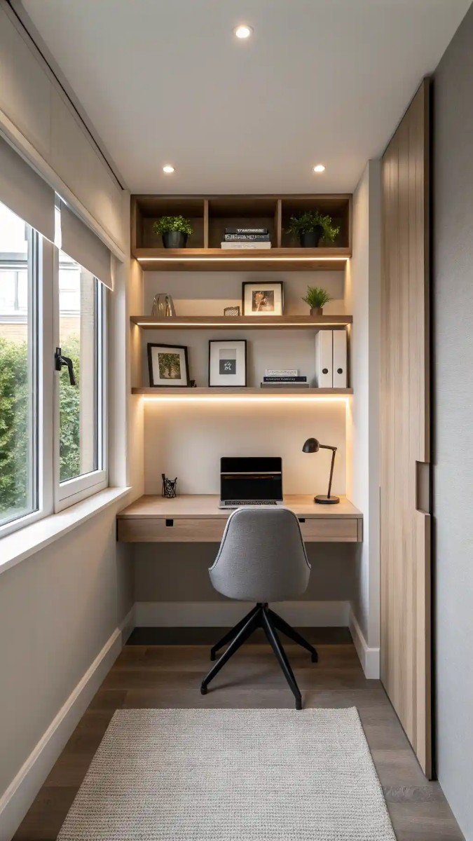 The warm wood tones and integrated lighting enhance the cozy atmosphere, making it an inviting spot for work or study. I find that incorporating natural elements like the small potted plants adds life and visual interest to any space. Effective