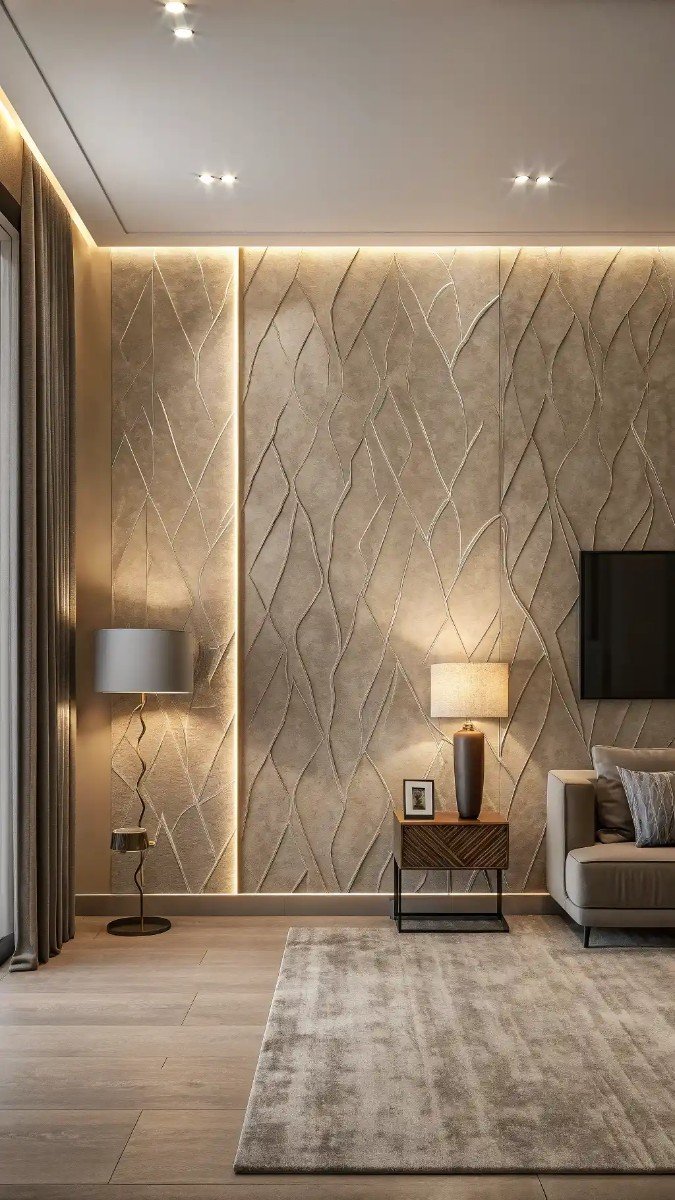 One aspect worth highlighting is how a statement wall can define a living space. In this image, the textured, subtly illuminated wall creates a beautiful focal point, transforming a simple corner into an elegant area. This is a fantastic example of corner living room decorating ideas that elevate the overall aesthetic.