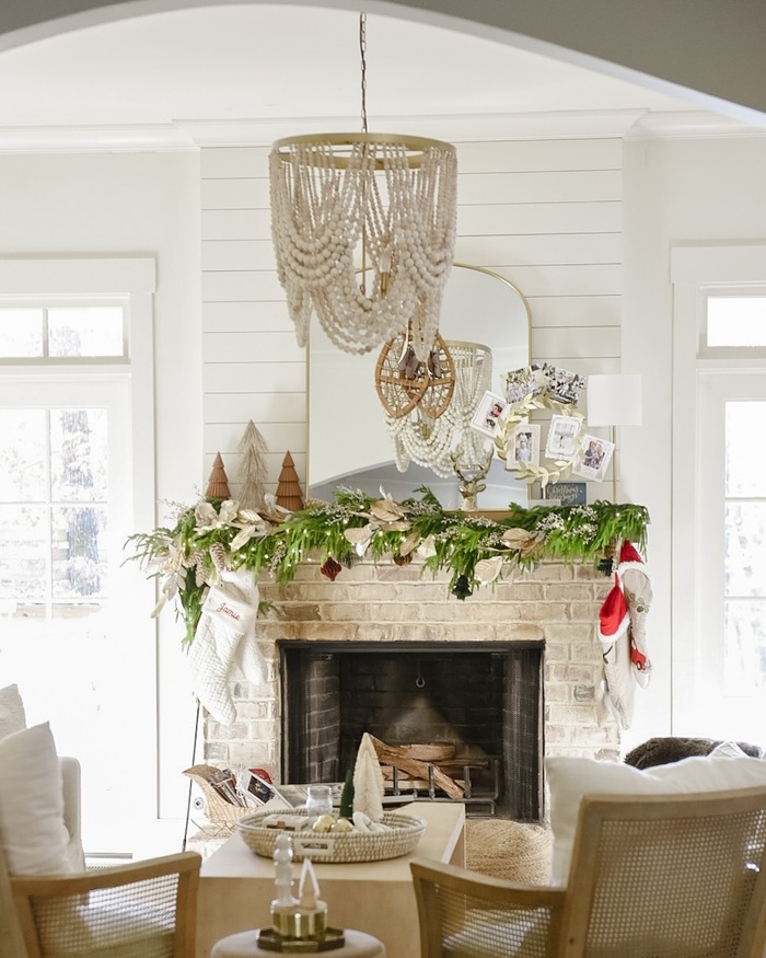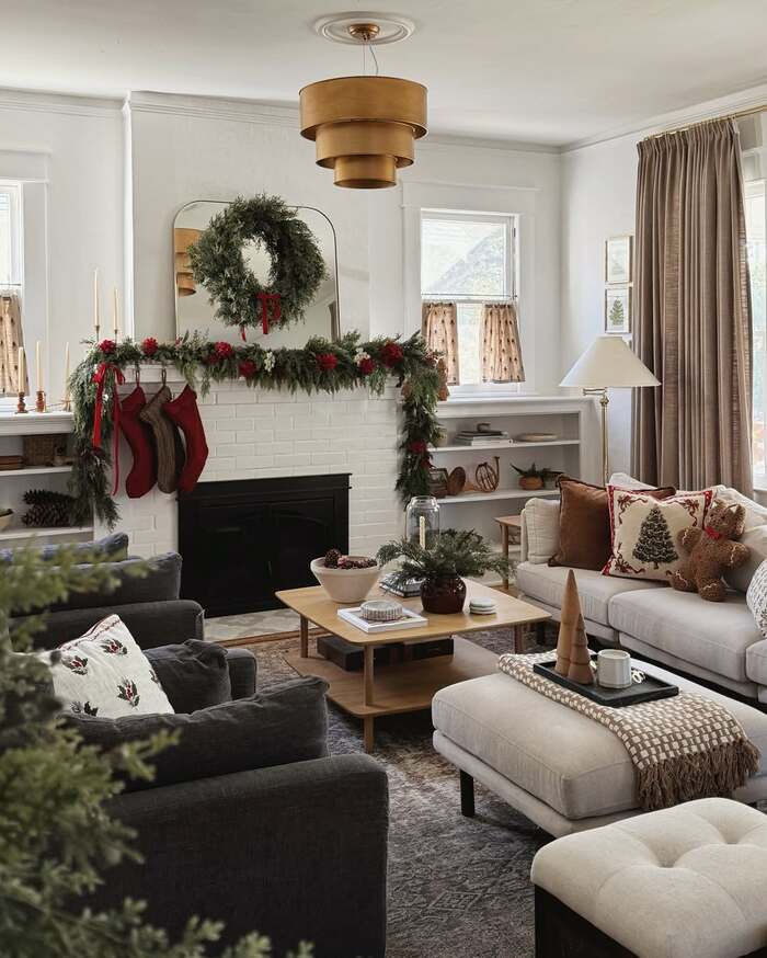 This is the most sentimental idea and I adore it. A simple green garland sits across a rustic brick fireplace. Stockings hang at the edges. The mirror above holds a string with tiny photos clipped on, like a memory timeline. There are woven chairs and wood accents so it feels organic. If you want cozy holiday living room fireplaces that tell your story, this is the keeper.