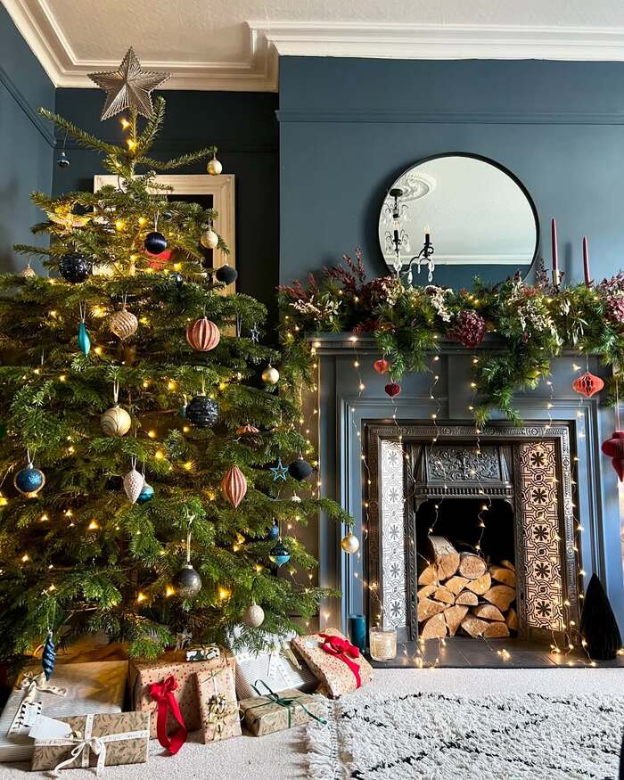The drama here is rich color. Deep teal walls wrap the room, making the silver and black fireplace gleam. A round mirror keeps the lines soft, and that garland is a full-on forest. There are hanging ornaments dripped from the mantel edge, like sparkling berries. The real tree leans a little imperfect, which I actually love. It reads human. If you want a warm Christmas fireplace that feels elegant without being stiff, this is your model.