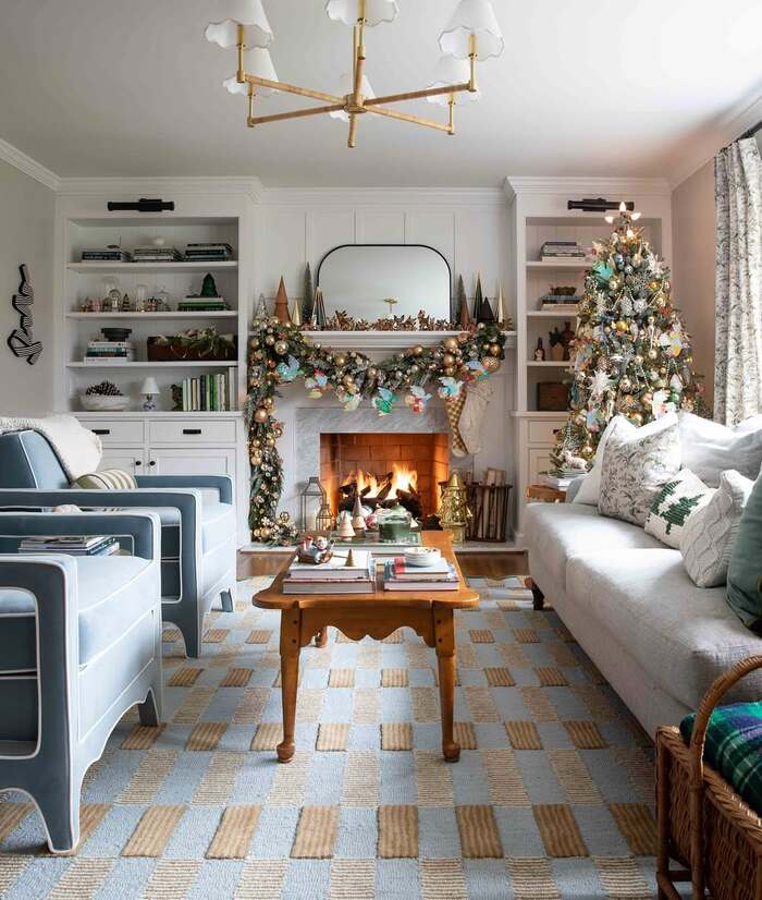 I didn’t expect to fall for pastels at Christmas, but here we are. The fireplace is framed by built-ins full of tiny houses and trees, then the garland goes playful with pale blue ribbon and soft gold baubles. The fire burns in a brick interior, which grounds all the sweetness. Those powder-blue armchairs are the secret sauce. They pull the room together with the check rug and make the tree feel intentional, not random.