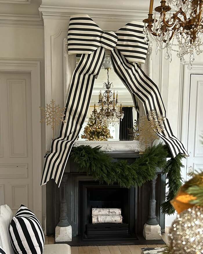 This one is bold and honestly kind of cheeky. A huge black and white striped bow sits over the mirror like a present waiting to be opened, and the mantel wears a single thick swag of evergreen. That’s it. No clutter. The contrast is the show. I hesitated to copy it because I’m messy by nature, but the payoff is huge. The room feels French and festive and clean.