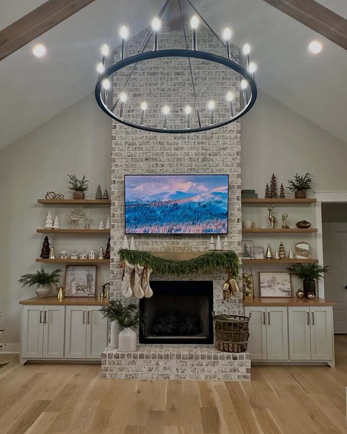 Here’s the builder-basic room that got brave. The brick chimney goes all the way up, and floating wood shelves flank both sides. The mantel holds a trailing green garland with oversized brass bells on one end and simple stockings on the other. The TV sits above, but the screen shows wintry art so it blends with the scene. A big ring chandelier ties the whole space together like a holiday crown.
