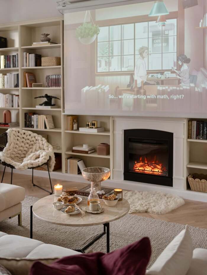 This room wins for comfort. A projector screen drops in front of the shelves, and beneath it an electric insert flickers like real embers. The coffee table holds warm pastries and mugs and I’m not kidding, I paused the photo to get a snack. The bookshelves are cream and soft, so the firelight bounces around. If your house doesn’t allow a real fire, or the budget says nope, this cozy holiday living room fireplace trick is perfect.