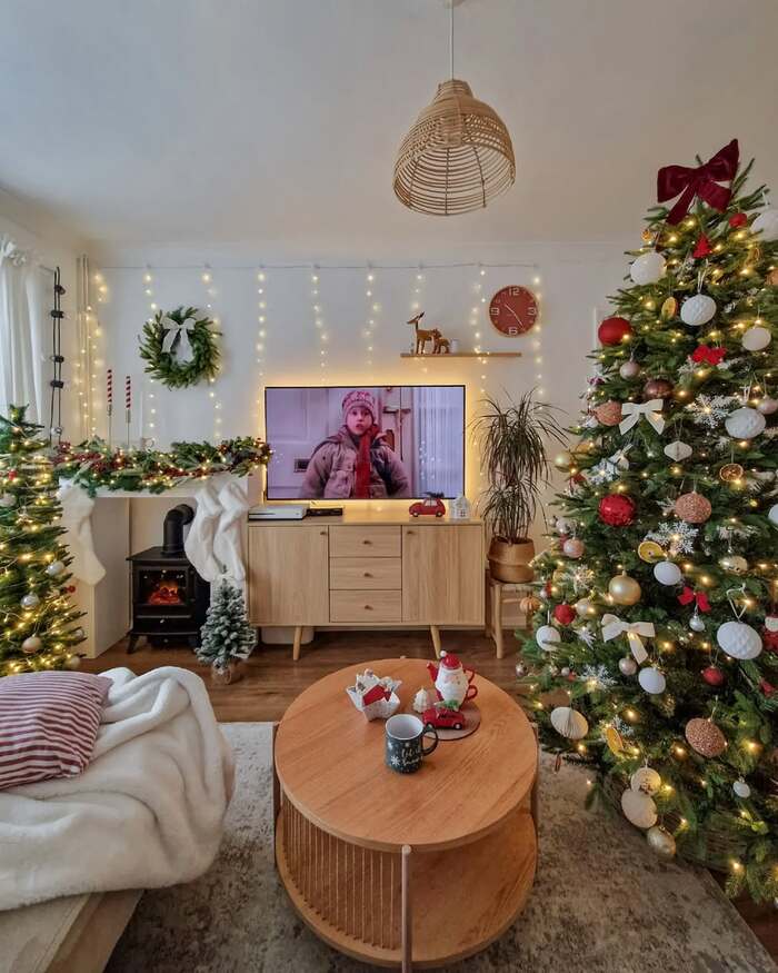 This is the softest Christmas glow. Fairy lights hang like a curtain behind the media console. A tiny black stove sits in the corner, which feels like a cottage at the edge of a forest. The garland is simple but charming, and the tree mixes matte and shiny ornaments in gold, white, and red. I turned on Home Alone the second I saw this room. A Christmas living room fireplace like this feels very real life. You can do it in a small apartment, no problem.