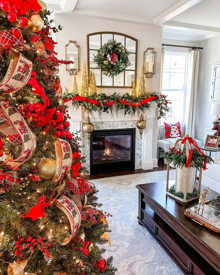 Traditional doesn’t mean boring. This room layers plaid ribbons, red berries, and gold accents with a mirror centered above the fireplace. The mantel is symmetrical, which feels soothing when the tree on the left is very full. I like how the coffee table has a lantern centerpiece that repeats the metallics. If you’re craving cozy christmas living room fireplaces that look like a family gathering from a favorite storybook, this is exactly it.