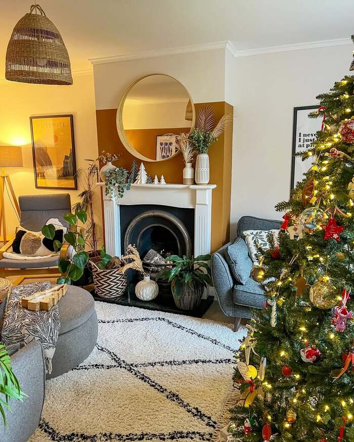 This curved firebox with the mustard wall makes me want to read a mystery book. There’s a round mirror, woven light shade, and so many plants that the fireplace feels alive. It’s not loud Christmas. It’s quieter, kind of collected. The tree twinkles from the edge, and small ornaments give it a handmade flair. If you prefer cozy holiday living room fireplaces that lean boho and modern, this direction feels fresh.