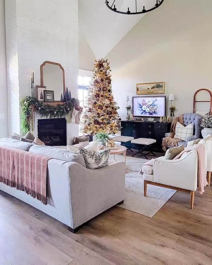 This scene whispers, not shouts. The fireplace is clean white, the garland has a faint eucalyptus tone, and the tree mixes blush, cream, and cocoa ornaments. There’s a tall mirror and soft throws everywhere. I call this a cozy holiday fireplace look for people who love neutrals but still want a pinch of sparkle. Also, the high ceilings help the tall, narrow tree show off. You can fake that by placing your tree on a low platform or box covered with a tree skirt.