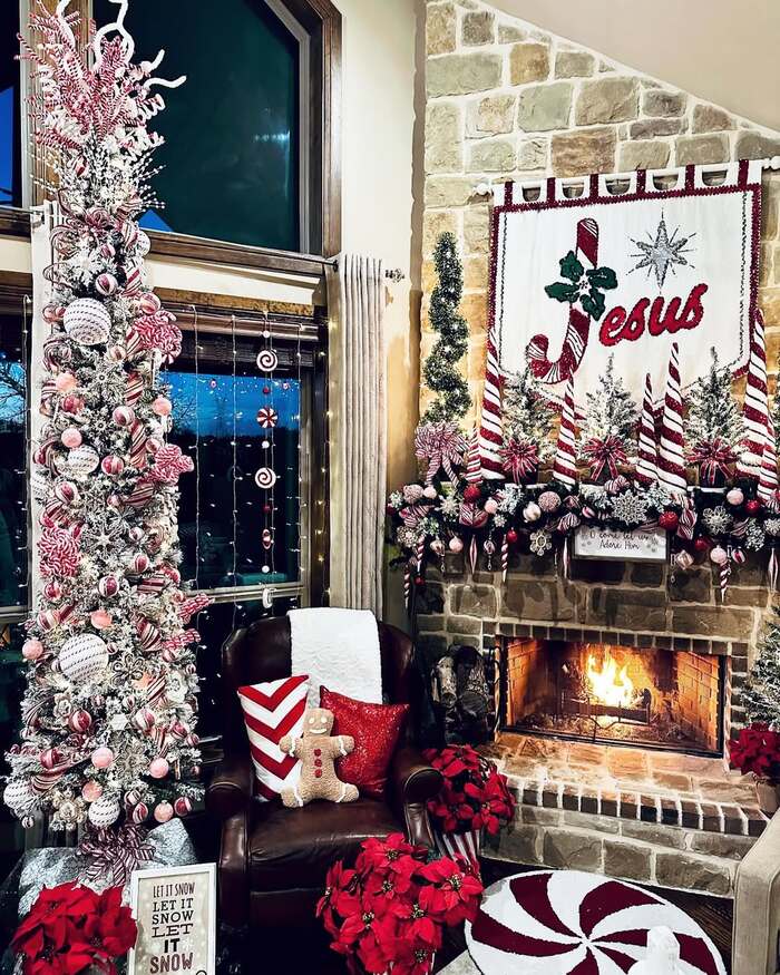 Peppermint stripes meet rustic stone and somehow it sings. The mantle wears snow-tipped greenery with pink and red ornaments, and the banner says Jesus with a candy cane J which is such a smart nod to the season. There’s a skinny flocked tree stacked with candy picks, and a little gingerbread man snuggled in a chair. If you like faith-forward decor, this is a heartfelt cozy christmas living room fireplaces style that still feels stylish.