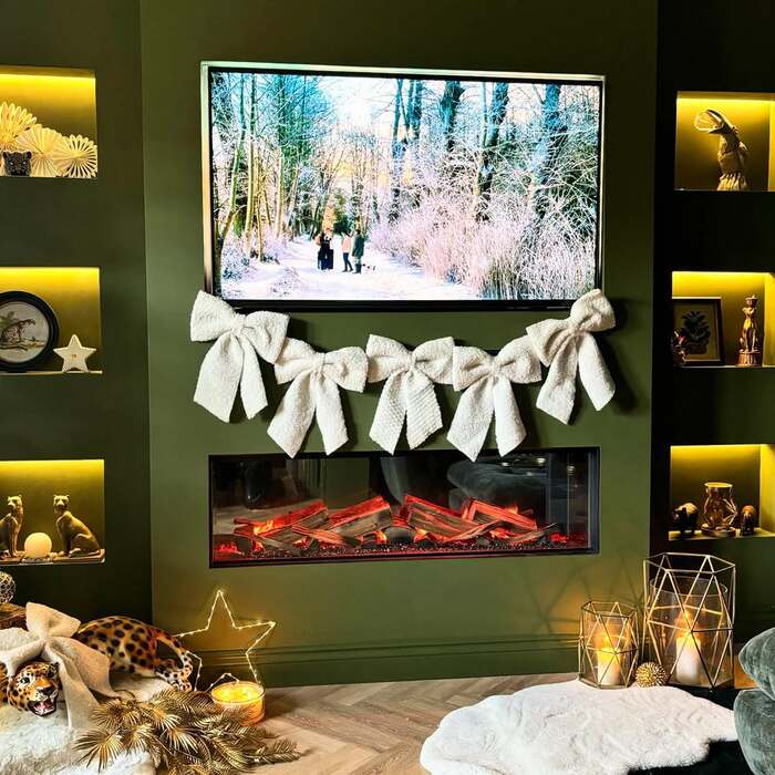 This one is moody in the best way. Dark green wall, floating shelves with warm niche lighting, and a sleek electric fire beneath the TV. Then the twist. A chunky knit bow garland, like scarves tied in a row, stretching across the mantel zone. I tried to act chill about it but I wasn’t. It’s a simple idea with massive charm. If you like modern cozy Christmas fireplace design that still feels soft, steal this.