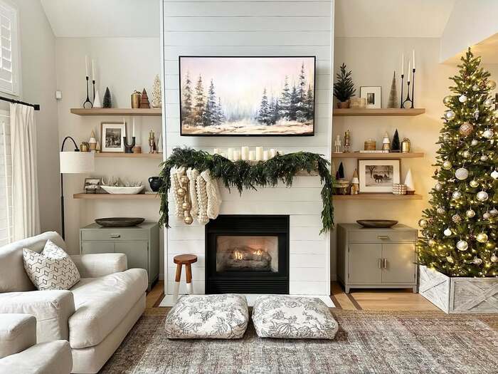 I call this one snow-lodge calm. White shiplap, a low-profile mantel, and shelves styled like a tiny shop. The garland hangs naturally, not fussy, and there’s a creamy looped knit swag for softness. The tree stands in a wood planter box, which makes the whole corner feel built-in. This is one of those cozy christmas living room fireplaces that stays pretty even after the ornaments go away in January.