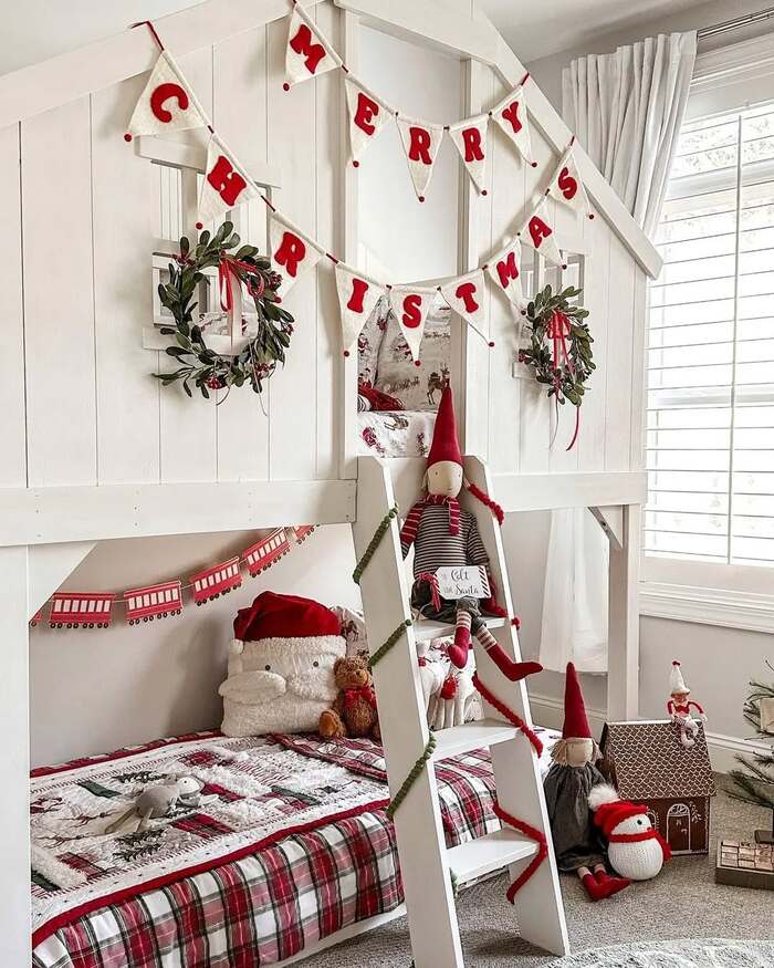 This little loft bed reads like a storybook. The white house frame is a clean canvas, then the MERRY CHRISTMAS felt banner and twin wreaths add happy color. The ladder wrapped in red and green ribbon looks festive and also guides tiny feet at night. Plaid bedding grounds the palette so the elves and plush toys don’t feel messy. I’m a fan of the mini train garland tucked under the loft. It fills the negative space and keeps the eye moving around the bed.