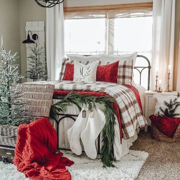 If you like country charm, this one hits the spot. The iron bed wears soft plaid layers with velvet red pillows. Stockings hang from the footboard with a cedar garland so you wake up to the good stuff. Small potted trees fill corners and candlelight flickers on the dresser. I love the wicker basket at the end, piled with a chunky throw, because it invites you to curl up right away.