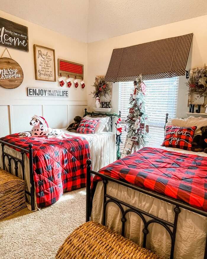 Buffalo plaid cabin twins: classic Christmas bedroom ideas with punch