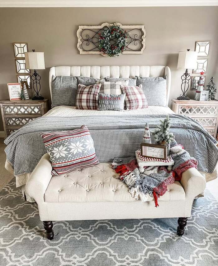 Try this: make the bed mostly white so your plaid throw and bolster are the stars. Place a long lumbar pillow to visually widen the bed. For the bench, thrift a wooden trunk or crate, then top it with a soft blanket so it doubles as extra seating. Lean a small artwork or sign behind the lamp for that layered cottage feel. These cute Christmas bedroom ideas work even in rentals because everything sits on top and nothing needs a drill.