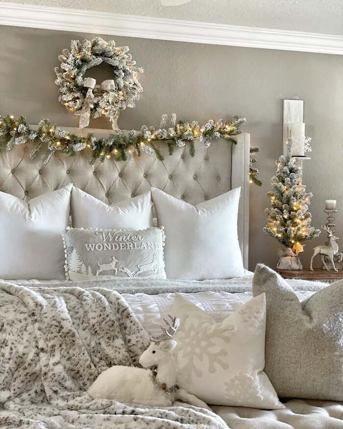 I didn’t expect to love an all-white room as much as I did, but wow, this one feels like the first quiet snowfall. A tufted headboard, fluffy faux-fur throw, white pillows with snowflake textures, and a flocked garland with warm lights. A small sparkly tree on one side keeps the balance from feeling too empty. It’s serene without being boring.