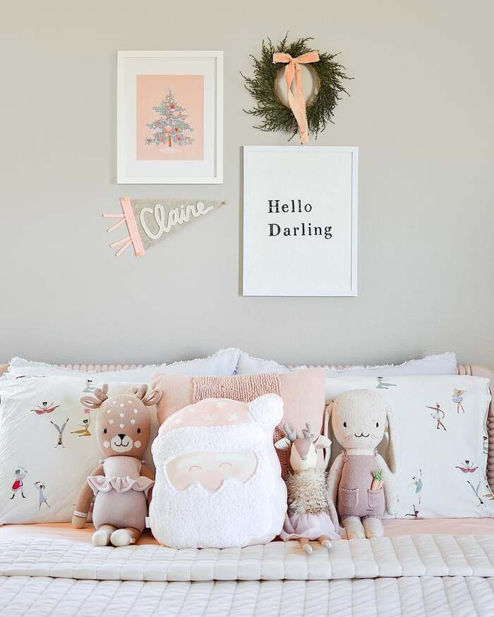 To build it, pick one anchor pattern for the duvet or blanket and keep every other pink item in solid textures like velvet or chenille. Add three novelty pillows max, so it stays delightful and not clogged with frosting. Tuck warm white lights into the greenery on the headboard and use satin bows in the same pink as your bedding. If you’re searching for adorable holiday bedroom ideas, this is the playful route that still looks polished in daylight.