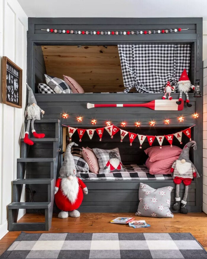 If you have a built-in bunk or even a loft bed, please copy this. The frame is a deep charcoal, layered with black-and-white gingham bedding and pops of red. A felt garland that spells Merry Christmas runs across the opening, and those chubby gnomes sit everywhere like happy little supervisors. It feels like a tiny holiday hideout.