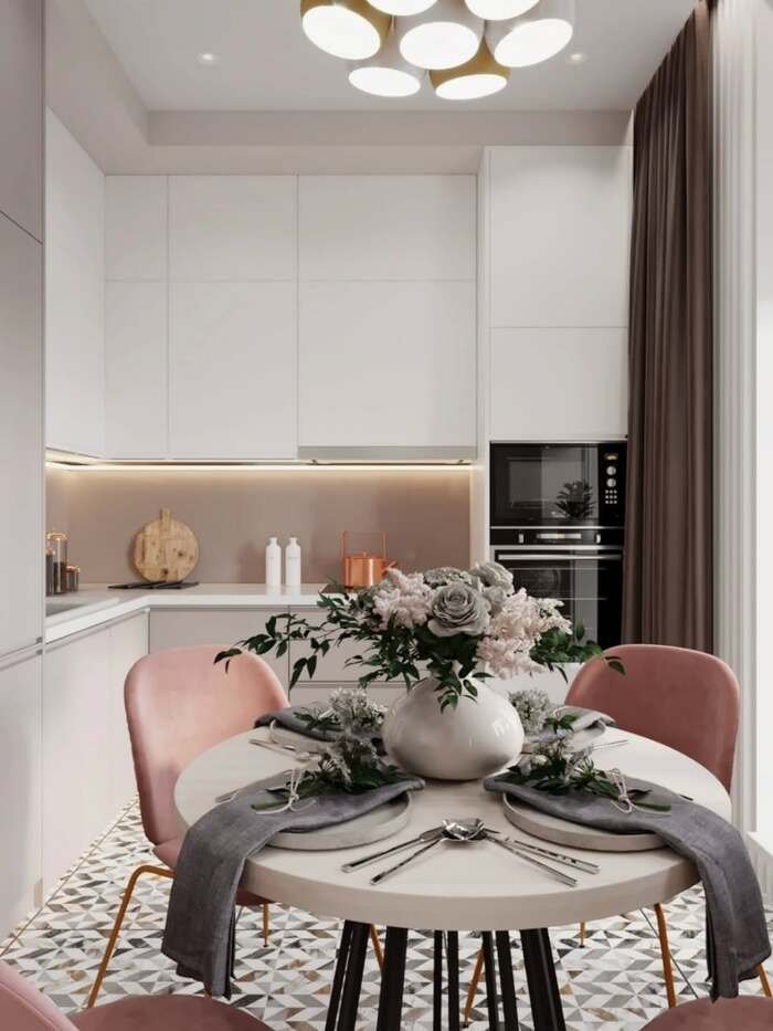 This decor for dining room table has that calm, modern kitchen vibe, but the blush chairs make it feel sweet instead of cold. The round white table is doing a lot here too. Round tables make people sit closer, so it feels more like a real hangout and less like a “formal dinner” situation. I’m kind of obsessed with how the centerpiece is low and fluffy, so nobody has to lean around it just to see someone’s face.