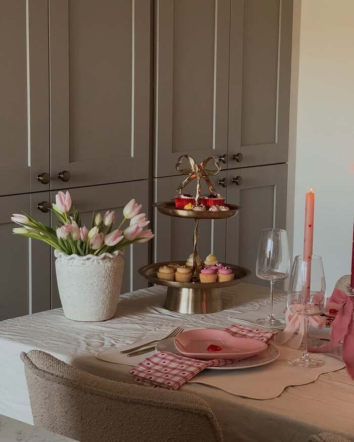 My little hack for table decor for dining room in a space like this is matching your decor to the room’s finishes. There’s warm lighting, pale cabinets, and soft pink tones, so the centerpiece works. If your kitchen is cooler, you could still do this decor for dining room table setup, but swap blush for beige or sage so it doesn’t clash.
