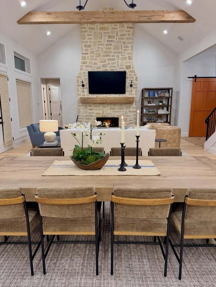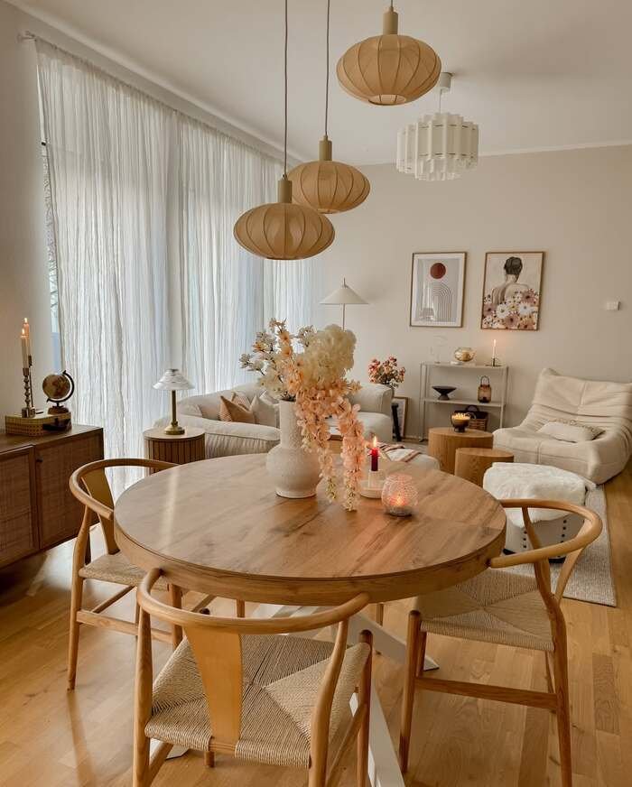 This is one of my favorites because it feels dreamy. The round table makes it feel friendly, like everyone belongs. The pendant lights and that big soft vase arrangement make the dining room table decor look like a gentle sunset, even indoors.