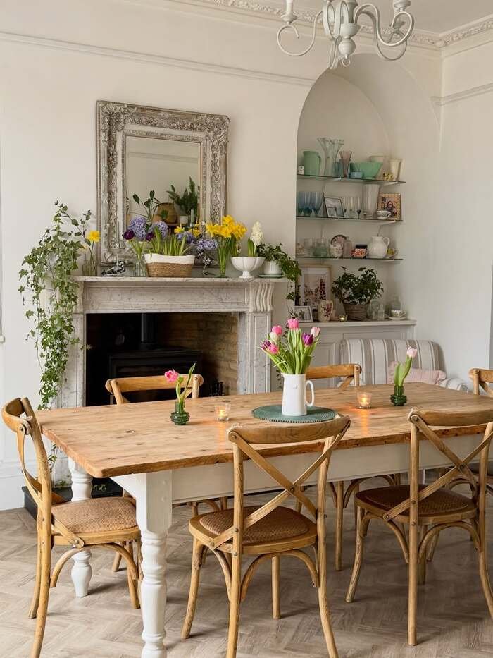 This dining room table decor idea is warm in a quiet way. The wood table, the simple tulips, the little candles, and all the soft white around it feels like a deep breath. I would copy this for spring or Easter, but also for any random Sunday when you just want the room to feel safe and homey.