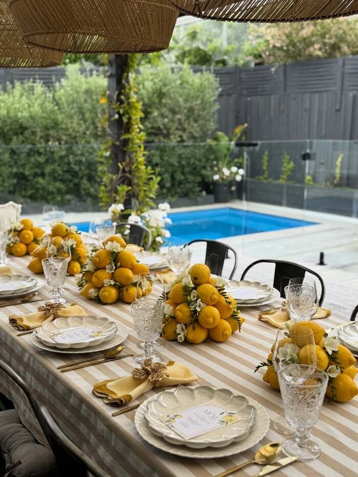 My tip is to keep the plates simple and let the lemons do the talking. Also, use clear glasses with texture, because it looks special without being complicated. And if you’re worried the fruit will roll, put it in a shallow bowl or nest it into greenery. That’s a small trick, but it saves your sanity.
