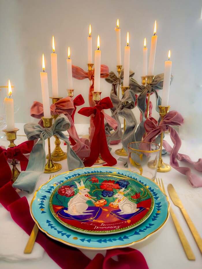 This one is so extra, and I mean, I kinda love it. The tall candles, gold holders, and velvet bows look like a fancy dinner scene from a movie. The colorful plate makes it even more interesting because it’s not all neutrals. It’s giving “I have stories” energy.