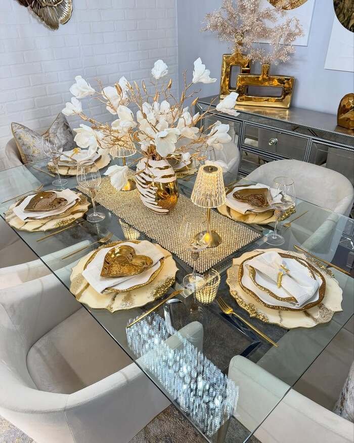 This dining room table decor is glitzy but still clean. The glass table is doing a lot because it reflects everything, so the gold accents look even shinier. The white flowers with gold branches look like winter, New Year’s, or “I’m hosting and I’m nervous so I made it fancy.”