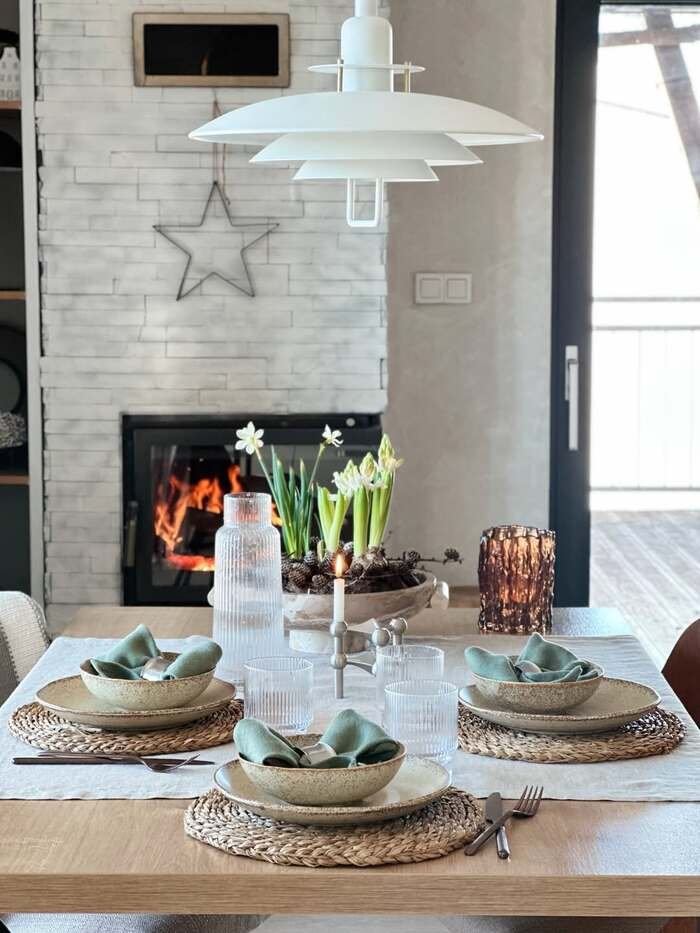 7) The calm Scandinavian table with woven placemats and soft green napkins