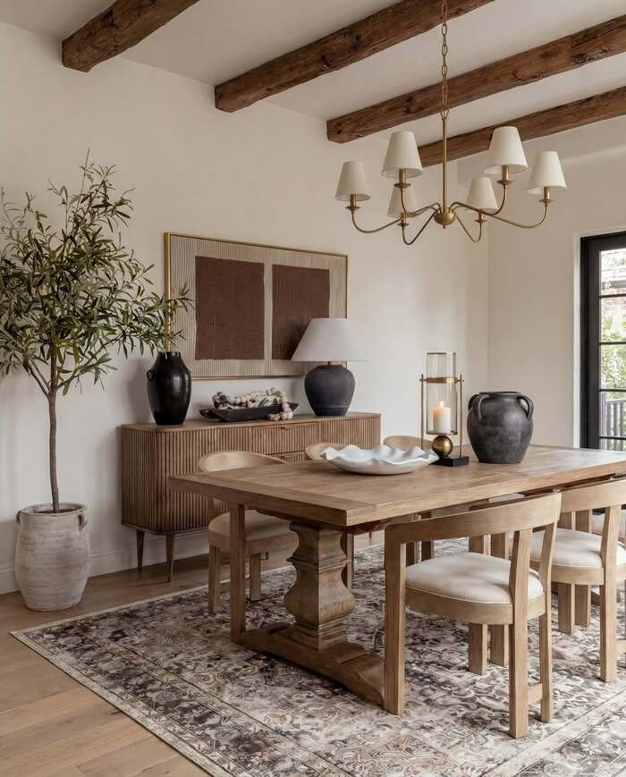 8) The rustic modern table with beams, big pottery, and neutral drama