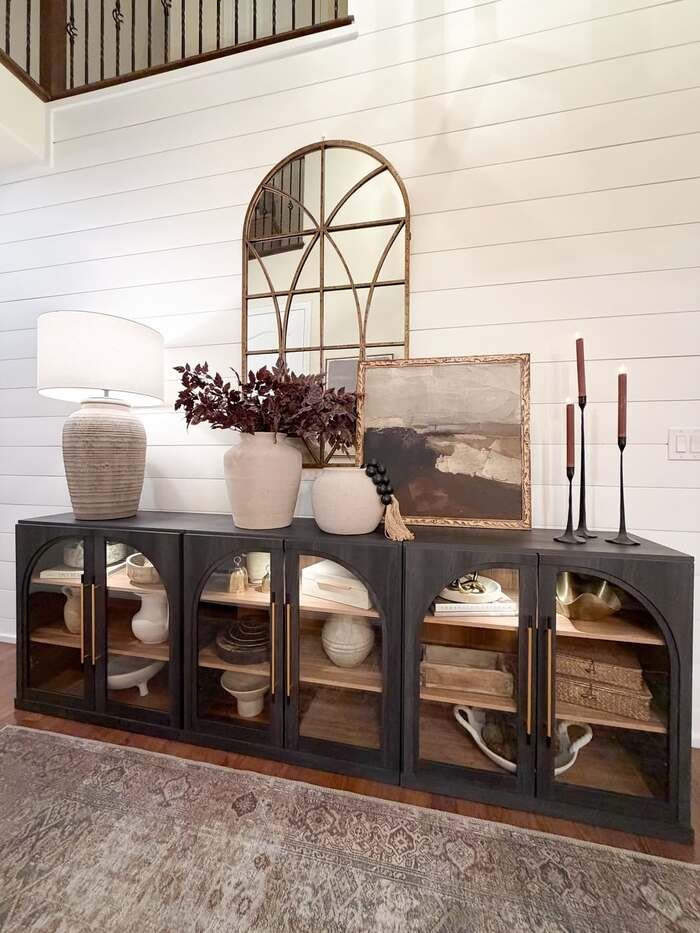 This first setup is moody and kind of fancy without trying too hard. The black buffet has vintage legs and carved doors, and then there’s that wall shelf cabinet above it with glass shelves and gold trim. It screams “grown up,” but in a fun way, like you might actually know what a decanter is.