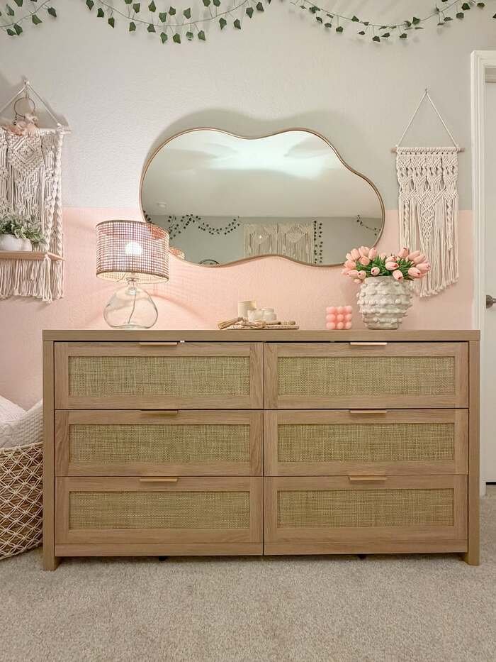 This setup is sweet in the best way. The buffet has those woven cane panels (so good for texture), and then the mirror above it is wavy and playful, like it’s smiling at you. I love how the whole thing feels light and calm, like the room is whispering “no stress today.”