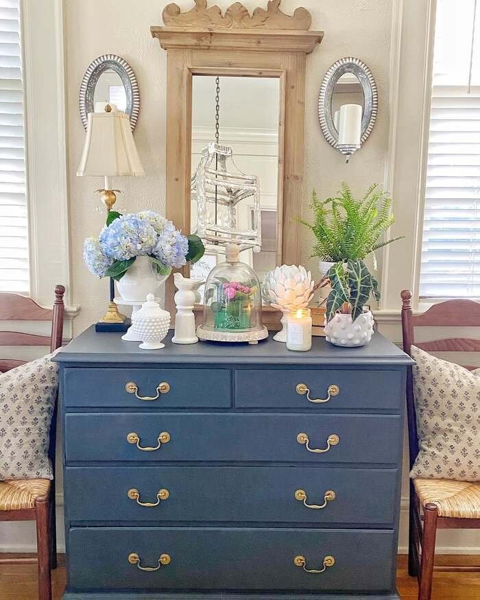 Okay this one feels like a home where people actually sit down and talk. The buffet is painted deep blue with gold pulls, and it’s topped with a mix of decor that feels collected, not store-bought all at once. There’s a big wood mirror behind it, plus little side mirrors, and a bunch of white pieces that make the blue pop.