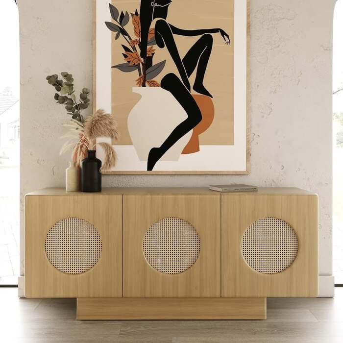 This buffet is a statement piece, period. It’s low and modern, the wood tone is warm, and the cane circles on the doors make it look custom. Then above it is that bold art print with strong shapes and warm colors, and it ties everything together. It’s modern, but not cold.