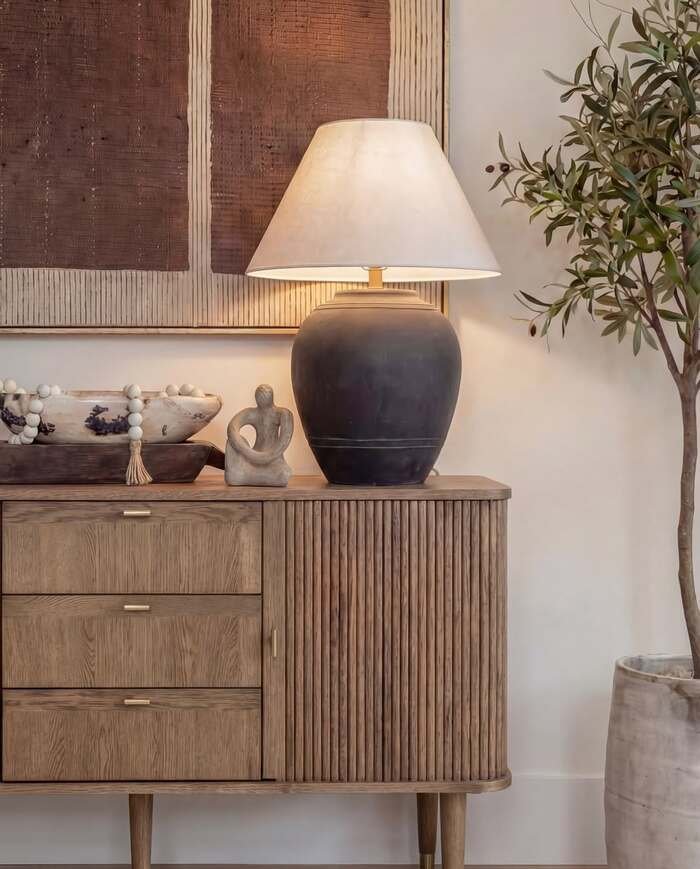 This one is moody but cozy. The buffet has ribbed/slatted texture on the door, and the wood tone is warm and grounded. There’s a big ceramic lamp on top with a soft shade, plus a low bowl and a small sculpture. The background art is large and earthy, and it’s basically the whole mood.
