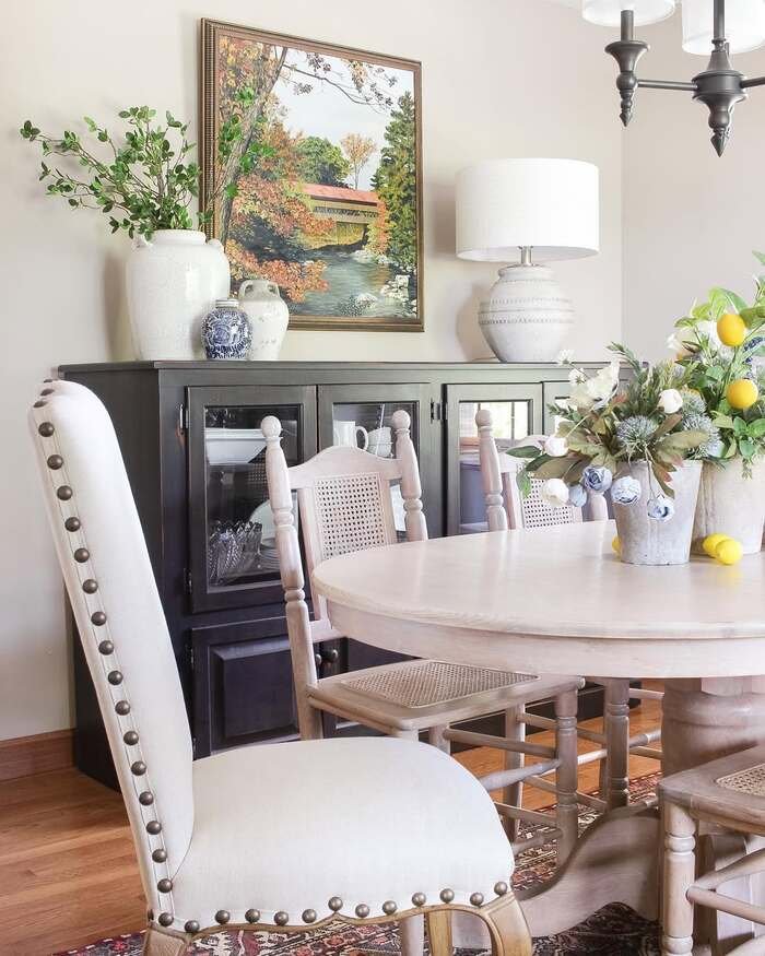 This room feels bright and classic, and that black buffet with glass doors anchors the whole space. I love the way it’s styled with white ceramics and a big white lamp, because the contrast is clean and sharp. And the painting above it adds color without being loud.