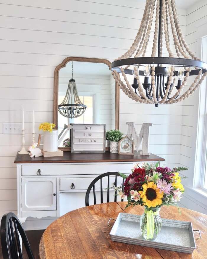 Farmhouse Dining Room Buffet Decor Ideas With Shiplap + Bead Chandelier Drama