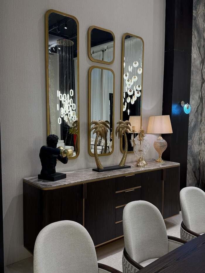 Okay this one feels like a fancy restaurant, but in your own dining room. The buffet is sleek and dark, the top looks like stone, and above it are three tall mirrors with soft rounded corners and a gold edge. I love how the mirrors make the room feel bigger, like your walls took a deep breath.